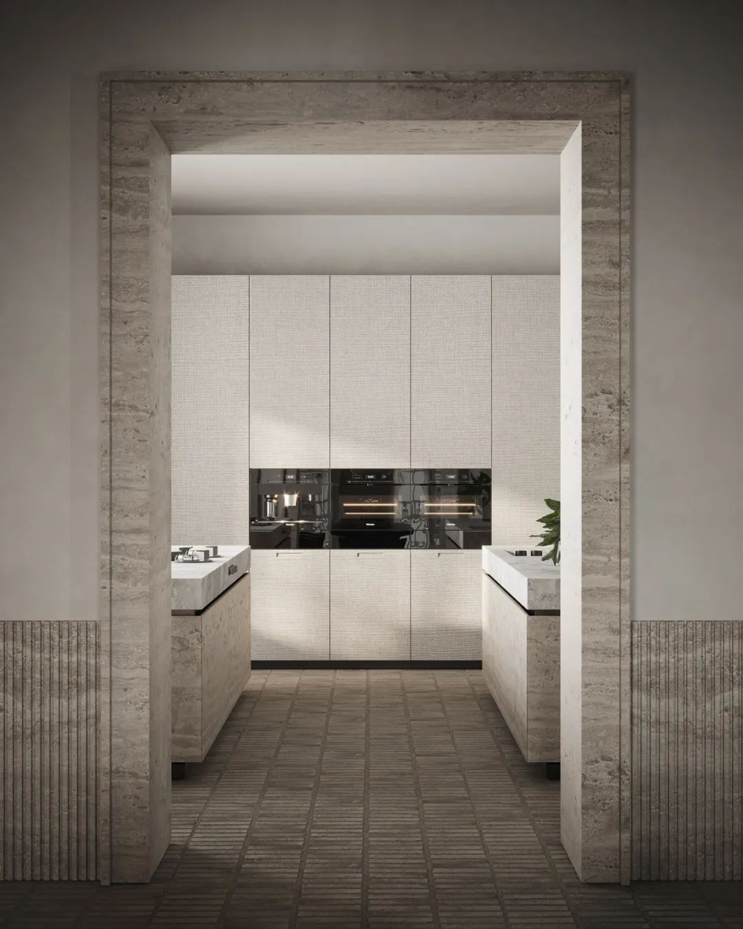 厨房中,对称式的设计奠定了整体空间沉稳的基调,大面的窗户保证了室内拥有充足的光线,给人明亮的视觉感受。中岛台选用天然石材,细腻的纹理提升了空间的整体质感。厨房电器镶嵌于橱柜之中,兼具美观性与实用性。餐桌餐椅同样选用天然石材,与整体空间相呼应。