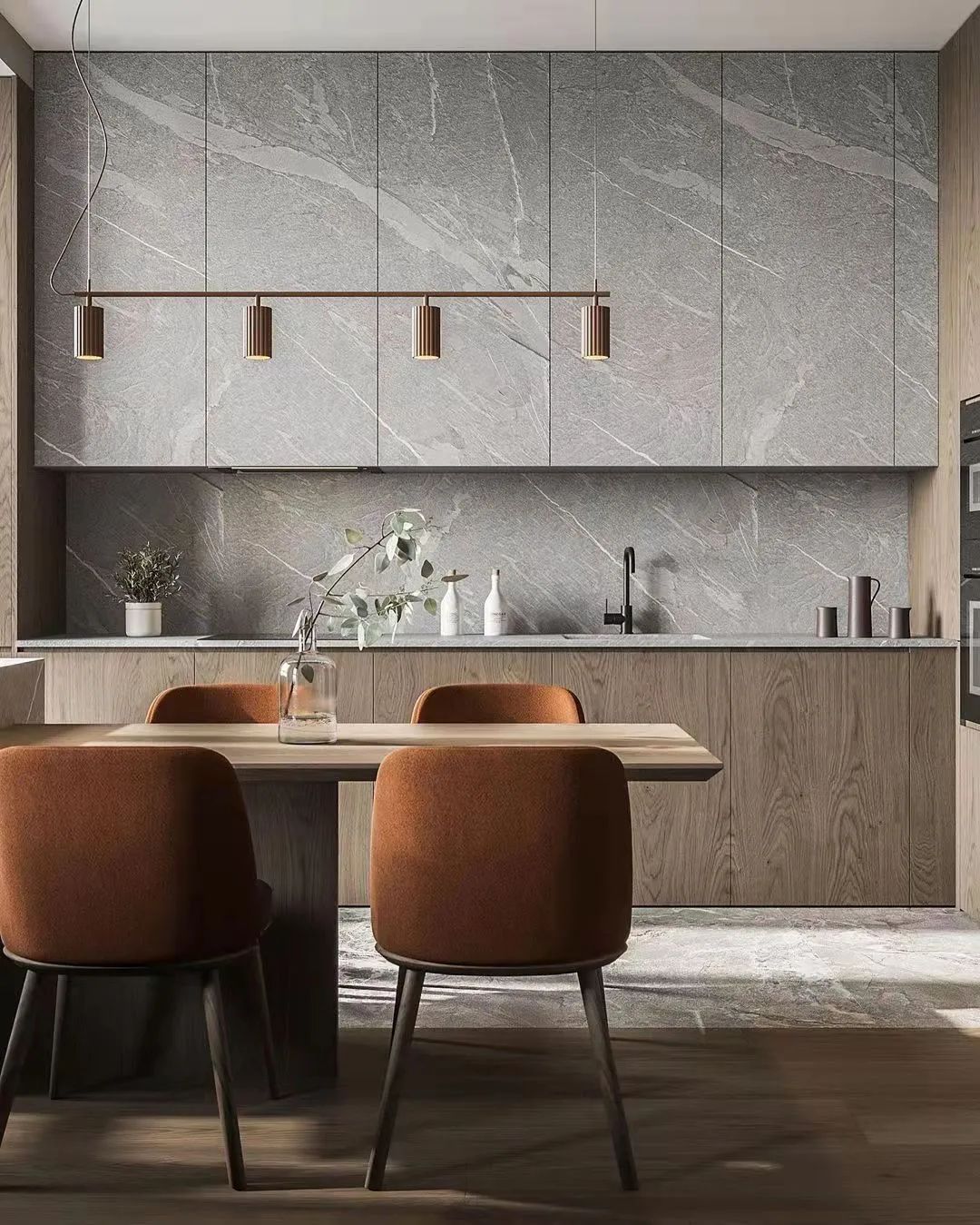 用餐区通过半堵墙和沙发连接而成的视觉分割线而独立,极富美感的选择了大理石工作台面和厨房墙面,既达成了色彩上的统一,也保证了实用性。温暖的橘色座椅搭配桌面上的绿色植物,房间里充满了生机。
