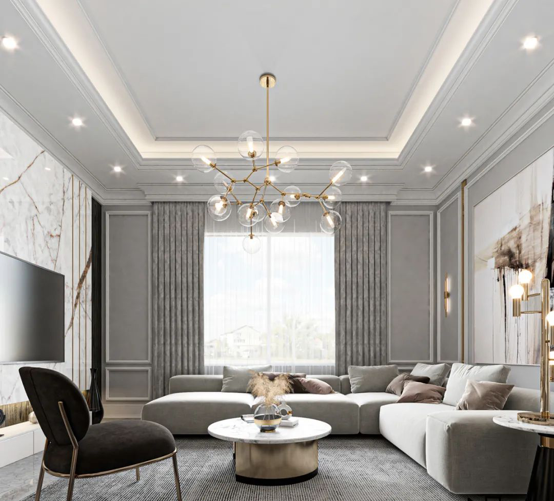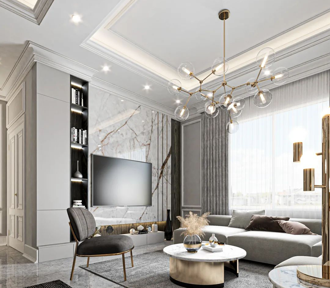 一入门便是收入眼底的客厅,面积虽然不大,却借助大面积的采光让空间更加明亮和宽敞,沙发、窗帘、地毯都用浅色系赋予空间温暖的质感,电视机背柜做了黑色的置物架格挡,方便储存。夸张的吊灯带来现代优雅的氛围感。