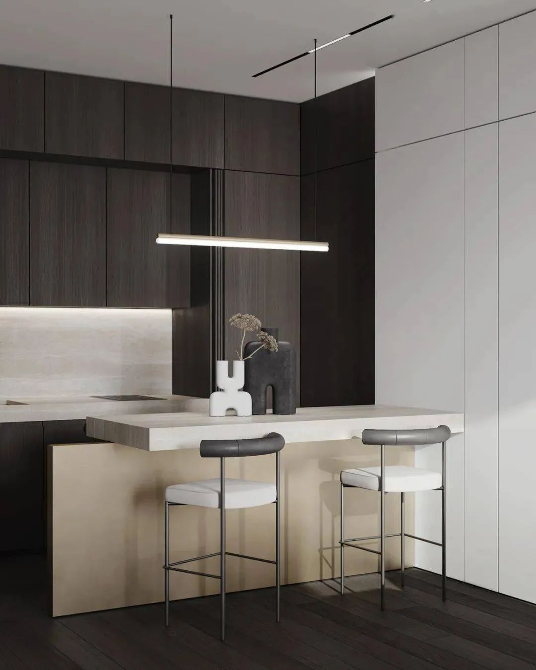 考虑到这个公寓的面积有限,设计师用到了紧邻厨房的两座吧台餐桌,在有限的范围内做出了舒适的厨房空间和就餐空间,餐桌也起到了一个隔断的作用,将厨房空间和客厅分割,金属和实木结合的餐桌椅有很强的肌理感。