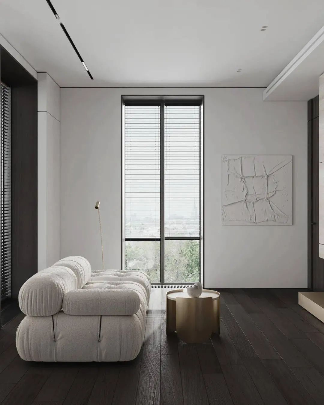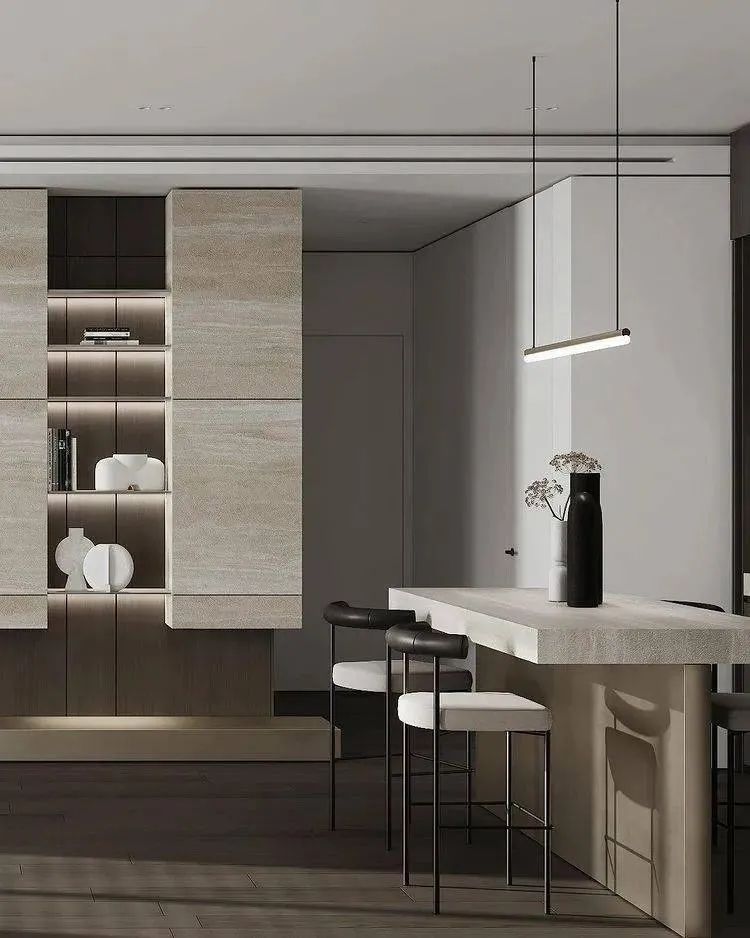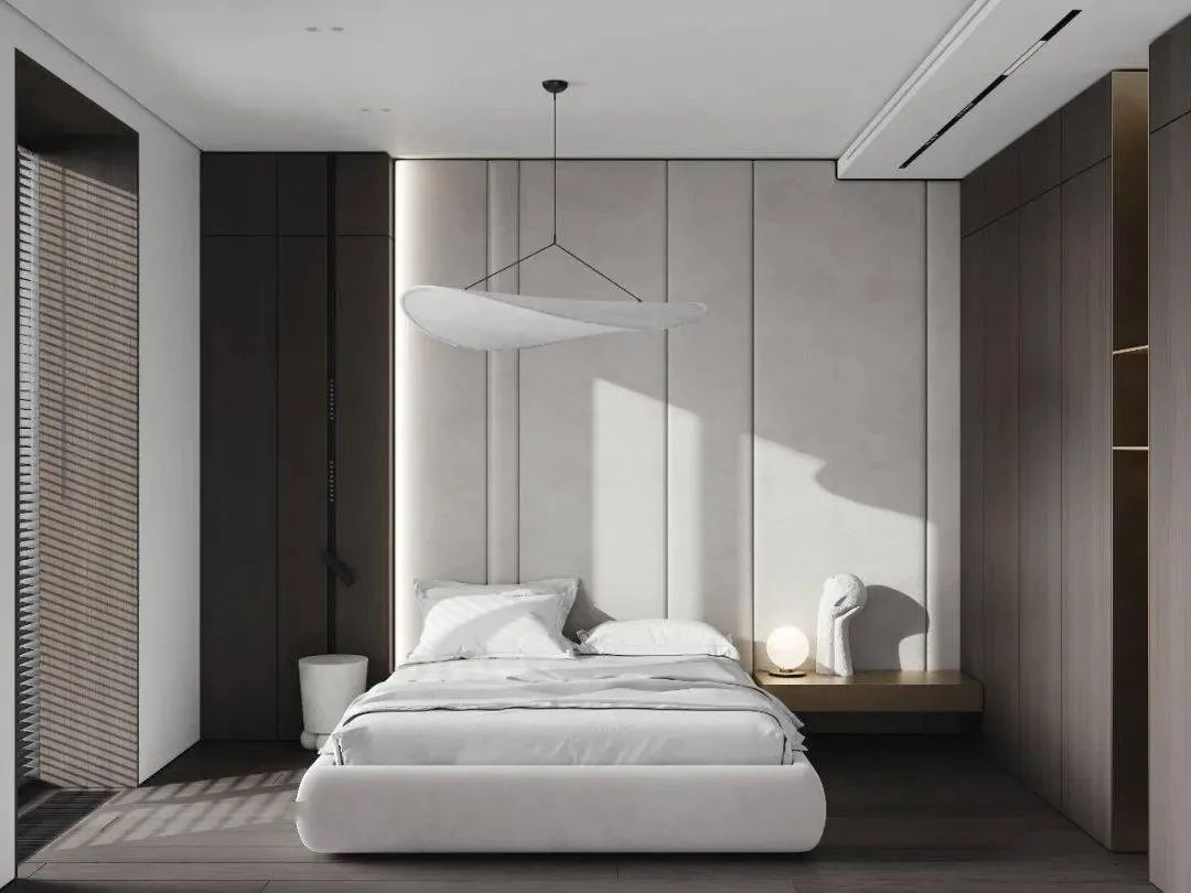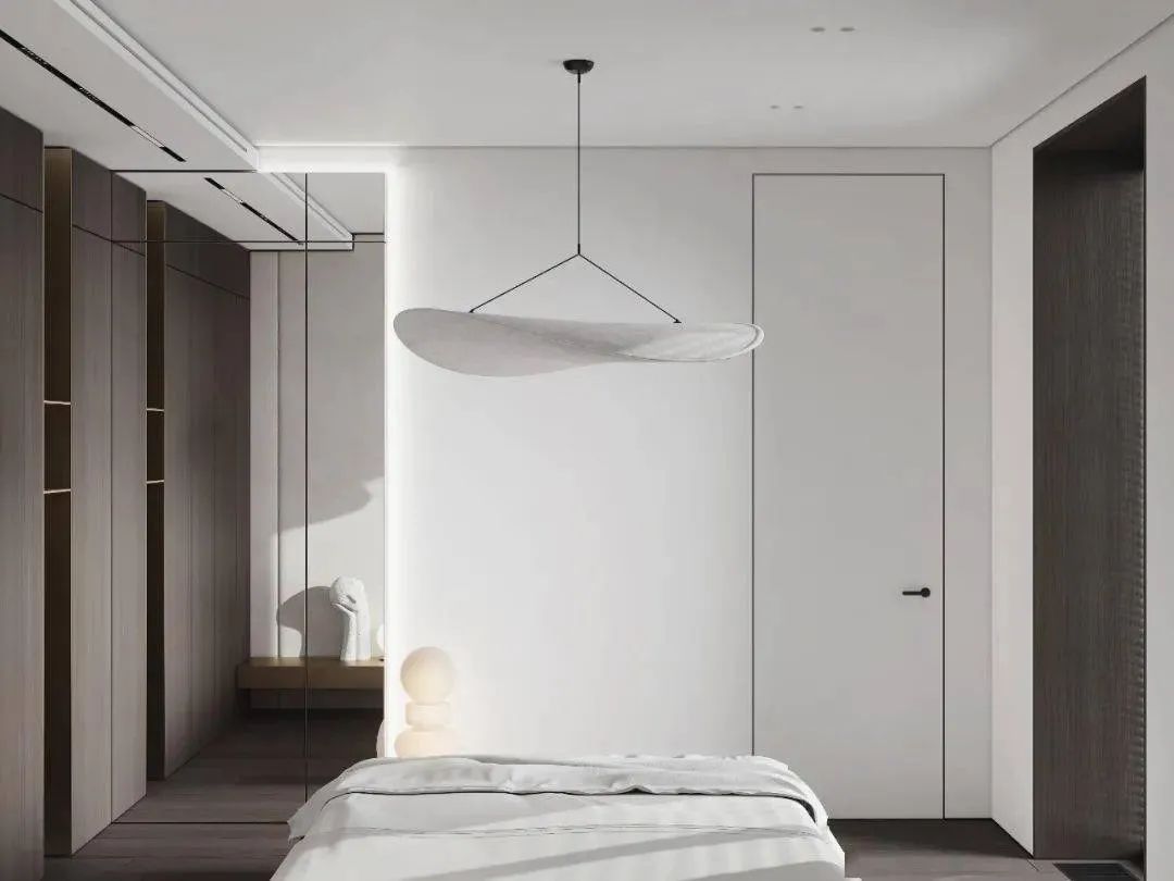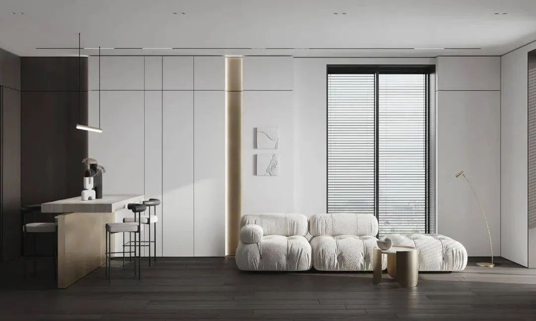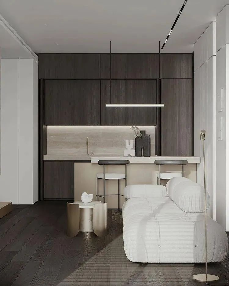 空间以白色调为主,通过用多种轻奢感十足的元素来对空间进行装饰,家具摆放简洁质朴,空间整体呈现出的氛围感强烈,这个狭小的空间在设计师的打造下成为了一个宁静的私人小天地。