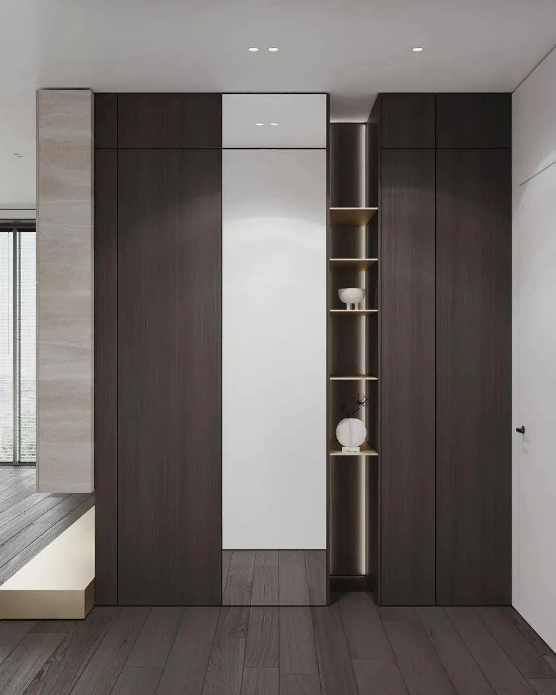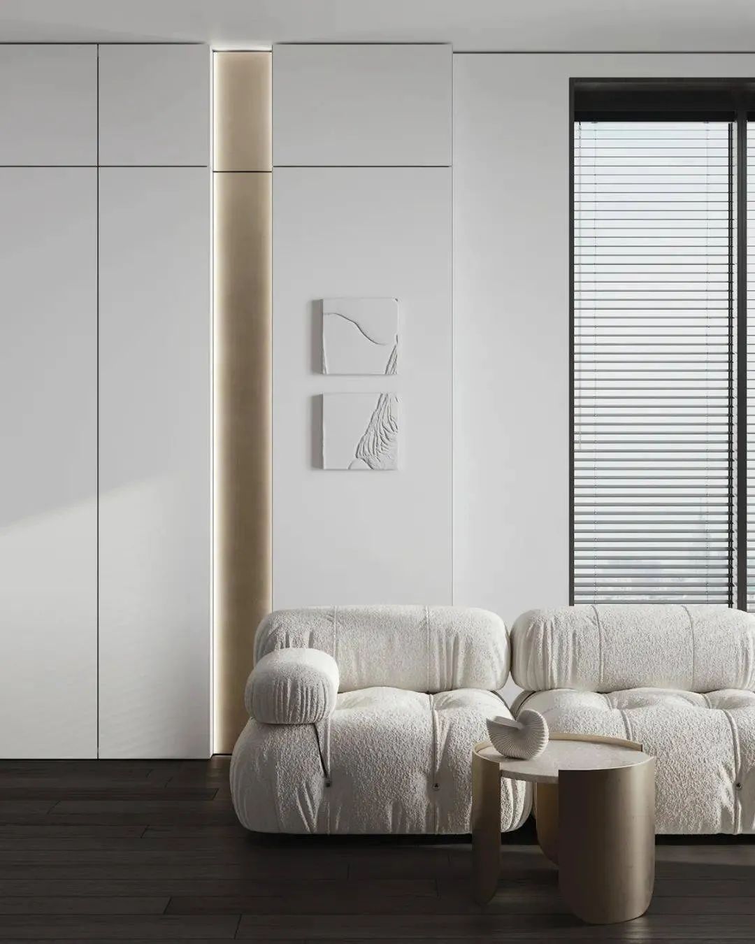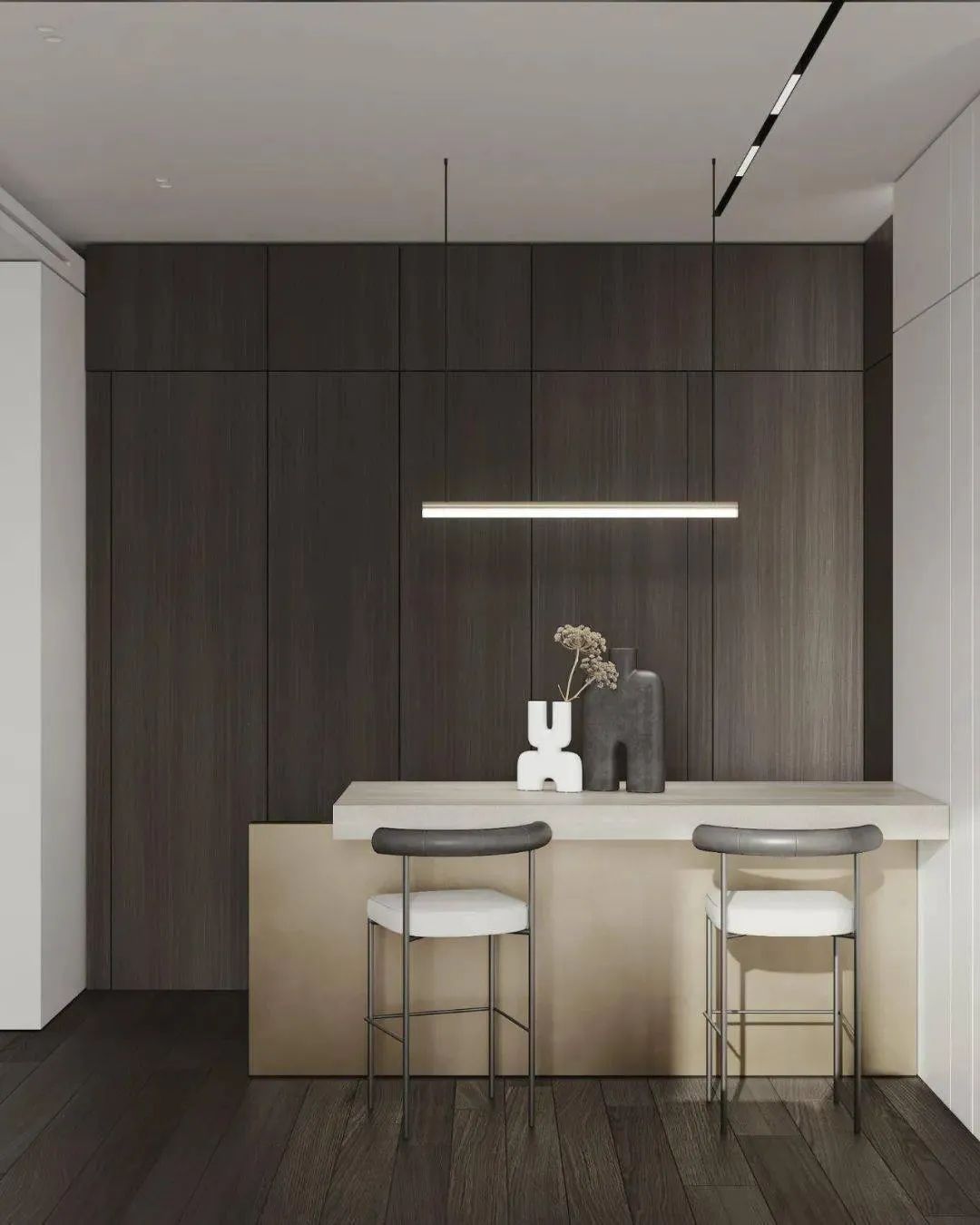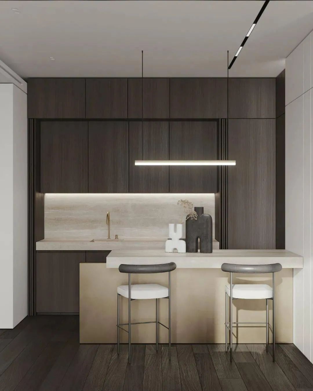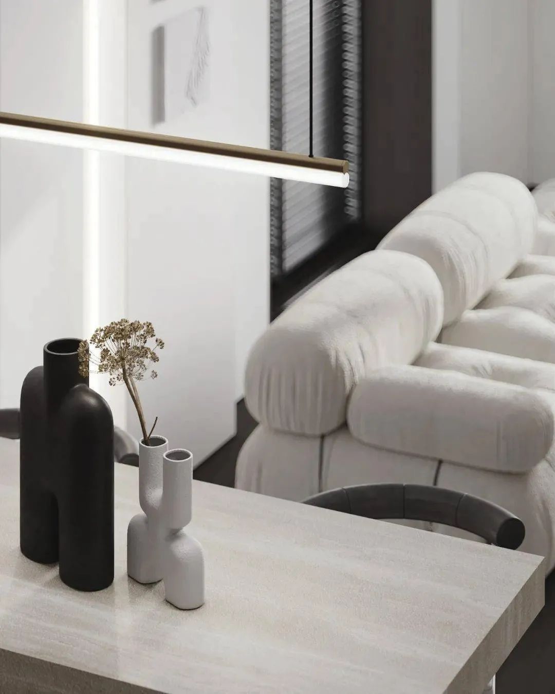 空间以白色调为主,通过用多种轻奢感十足的元素来对空间进行装饰,家具摆放简洁质朴,空间整体呈现出的氛围感强烈,这个狭小的空间在设计师的打造下成为了一个宁静的私人小天地。