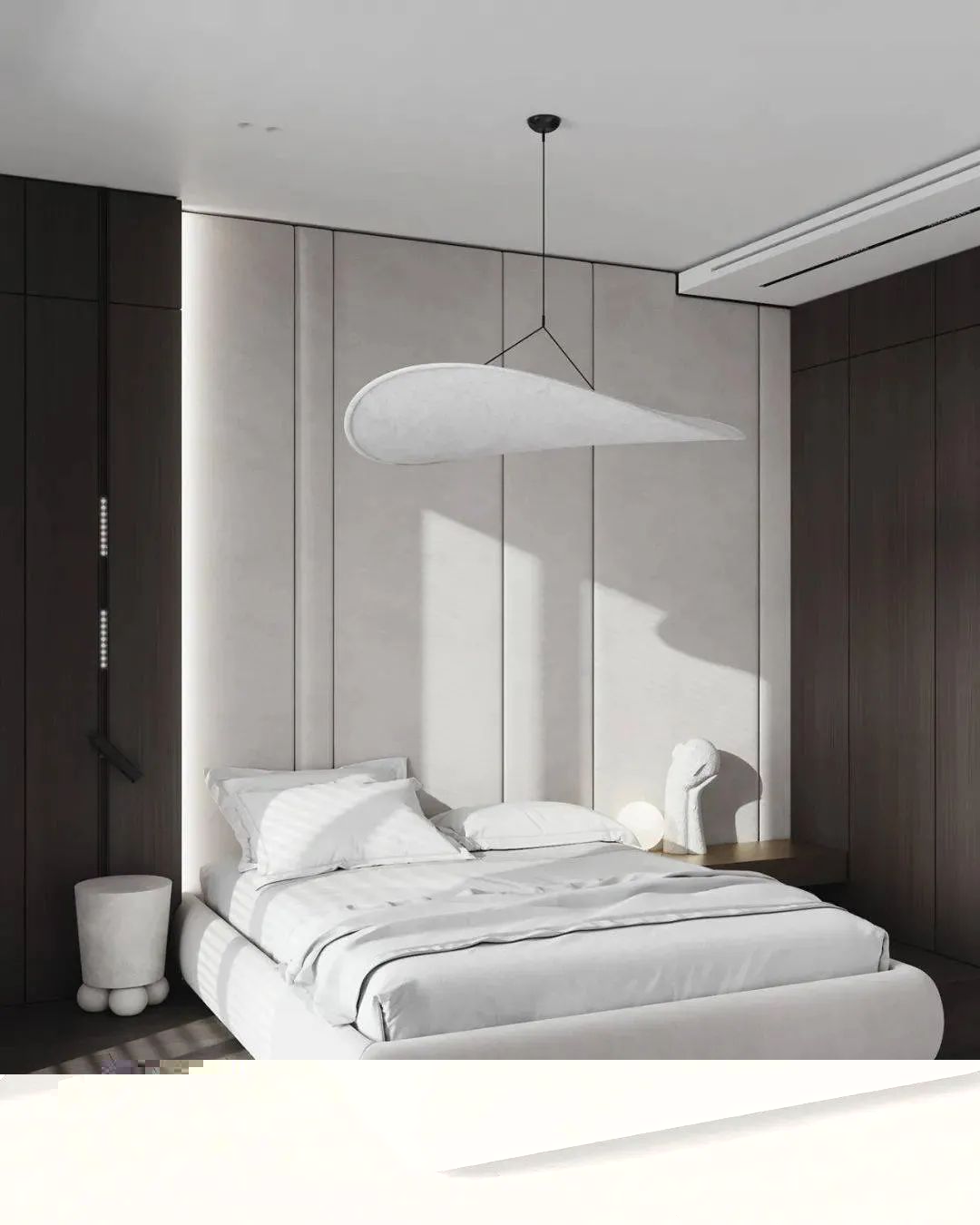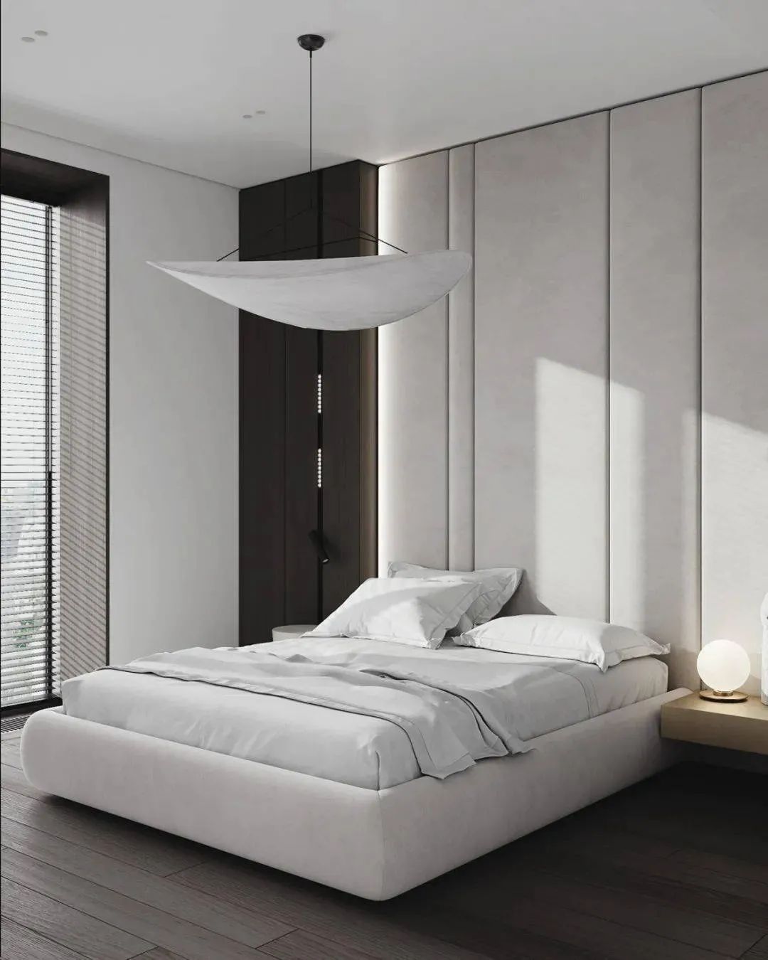 卧室以黑色和白色为主,黑胡桃色的柜体和地板搭配白色的墙面和双人床,营造出了明显的对比,整个空间色彩分明,黑白色的碰撞营造出了别样的美感。