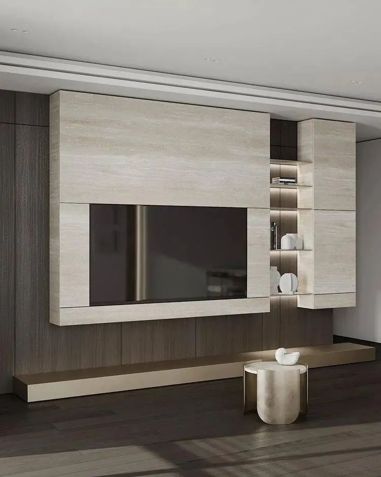 客厅空间质朴简洁,黑胡桃的柜体搭配白色的墙面,空间没有给人太繁复的感觉,更多的体现出了一种干练简洁的氛围,白色柔软的沙发看上去很舒适,几何块状的电视柜看上去也大气十足。