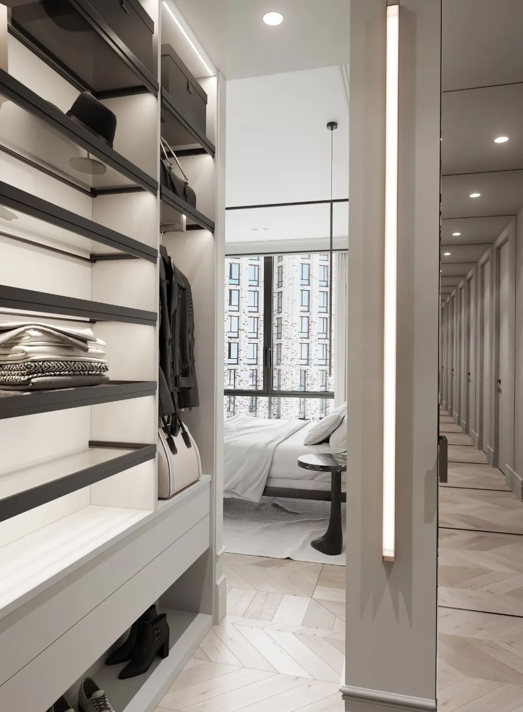 设计师在内部设计中采用了方形,同时采用了餐盘形状的吊灯,让整个客厅显得柔和简洁。客厅和用餐区以及厨房就证据了整个公寓的一半。