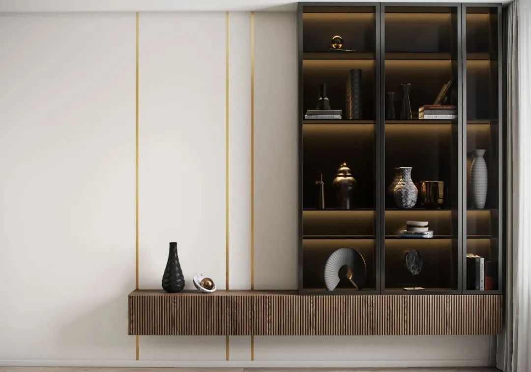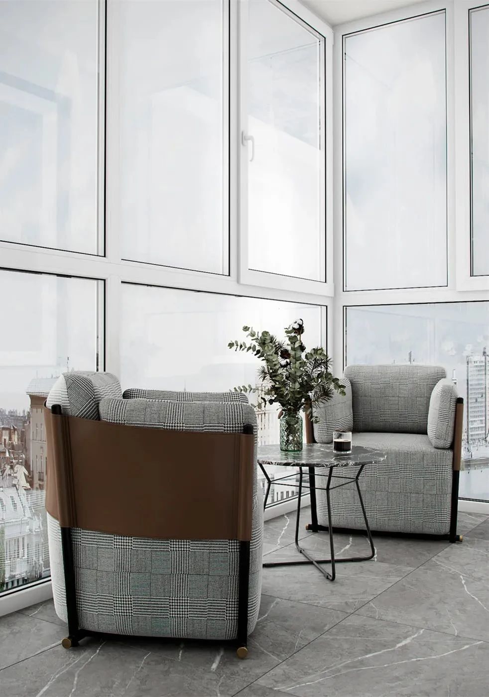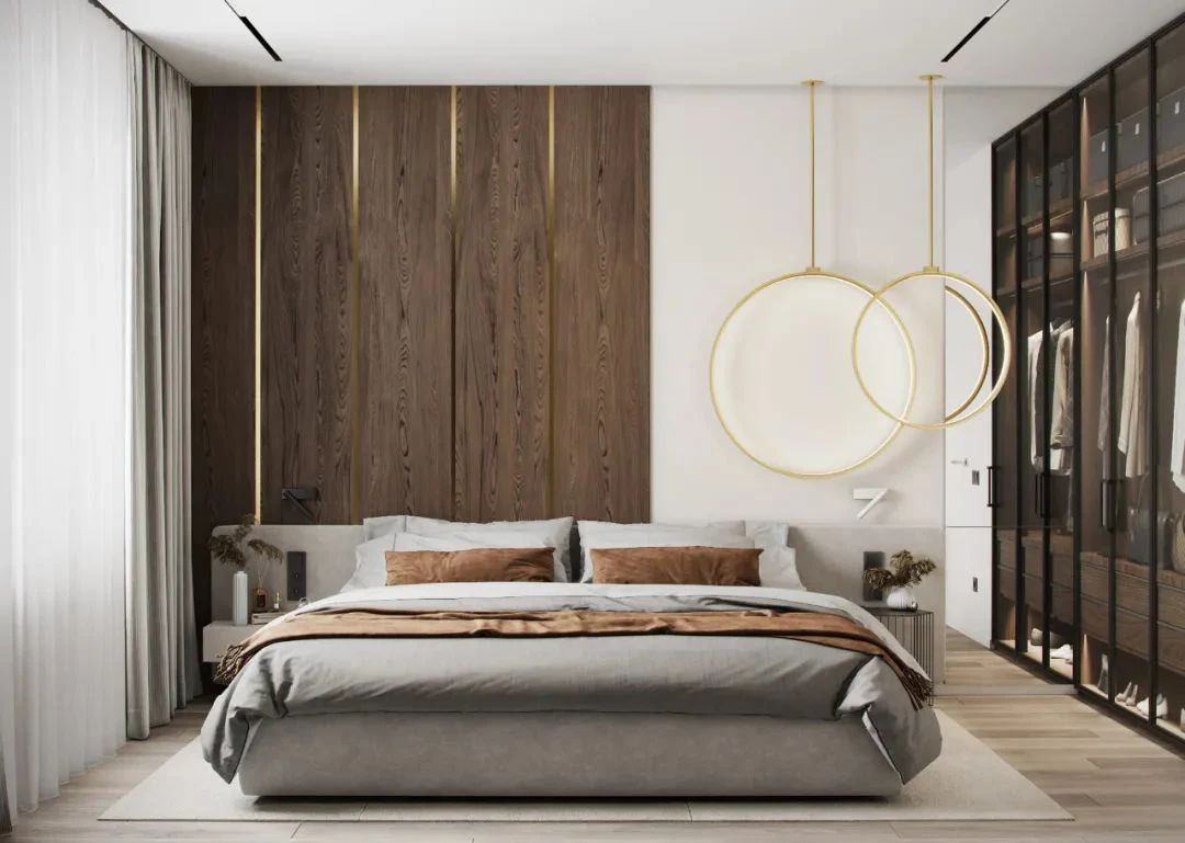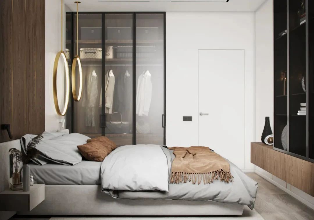 跳脱的橙色在浅灰卧室中显得格外活跃,墙上两盏圆润细致的弧形灯管将室内烘托出一股浪漫的氛围。