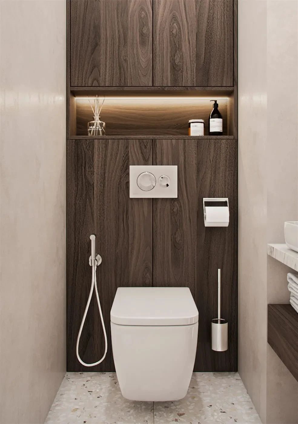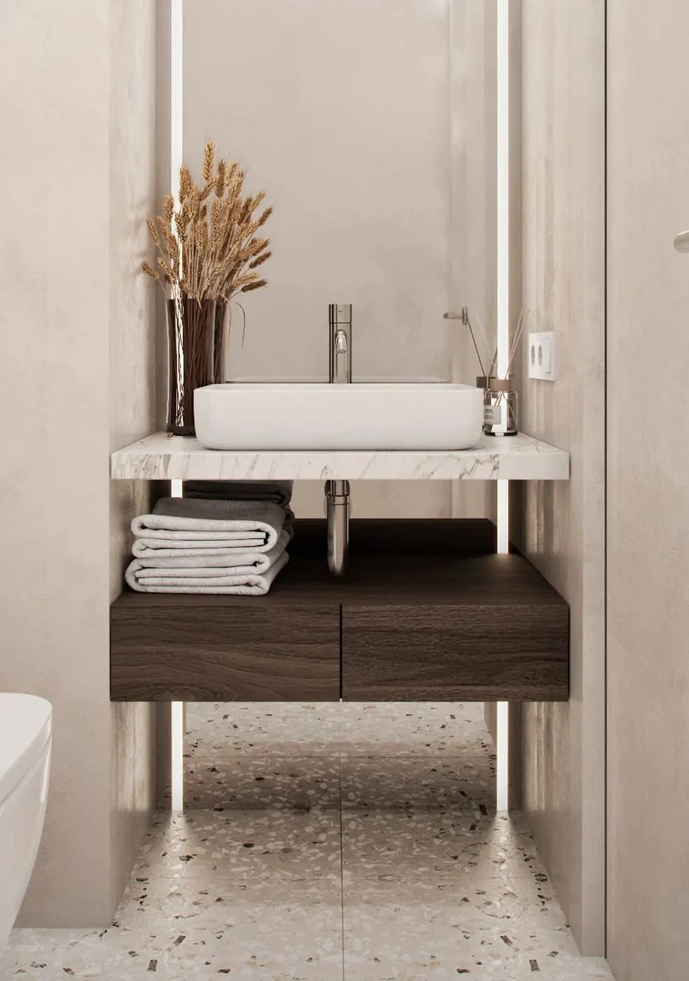 浴室利用水磨石作为铺垫,大理石搭建的洗漱台看起来大气有格调。利用干草植物和藤编织物的收纳筐用来点缀室内,显得整体既清新又治愈。