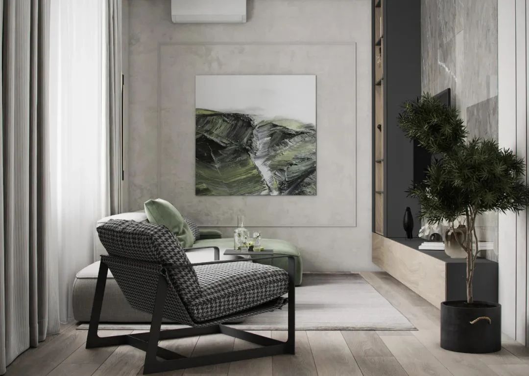 浅色的木质地板与复古绿的软饰相对比,交织成一片柔和温润的宁静空间。