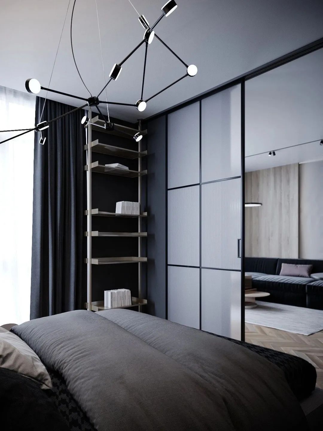 卧室中,白色竖纹板材搭配复古的人字拼木地板,打造沉稳而静谧的休憩空间。富有线条感的吊灯,展现出空间的几何美感。深灰色的床品与空间很好的融合,大面的落地窗保证了室内拥有充足的光线给人明亮的视觉感受。