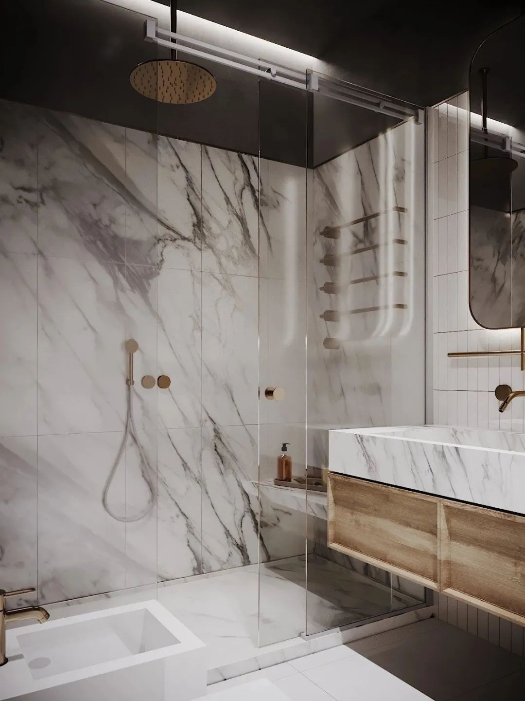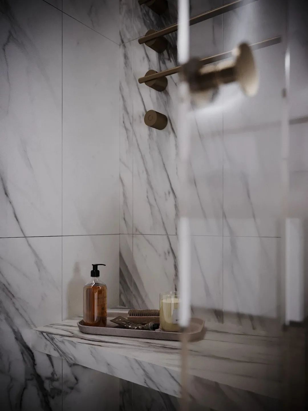 卫生间中,设计师选用白色与木色作为空间的主色调,营造柔和的空间氛围。白色大理石洗手台赋予空间轻奢气息,对称式的双台盆设计,美观大方。