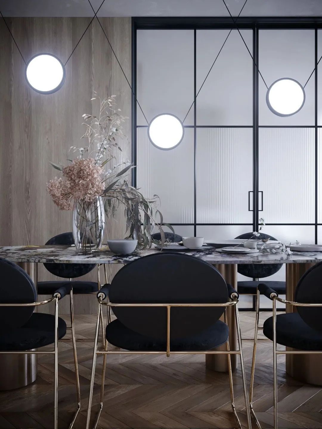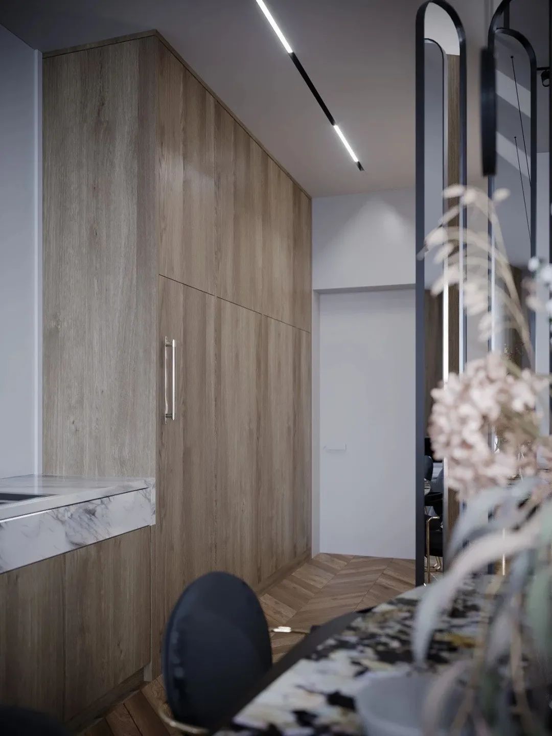 餐厅与厨房位于同一空间,在客厅的旁边,开放式的设计很好地利用了不大的空间。厨房的操作台选用白色大理石面板增添了空间的轻奢氛围,疏密有致的自然纹理相互呼应,整体简约而精致。餐桌上方的装饰植物展现了空间的生活美学。