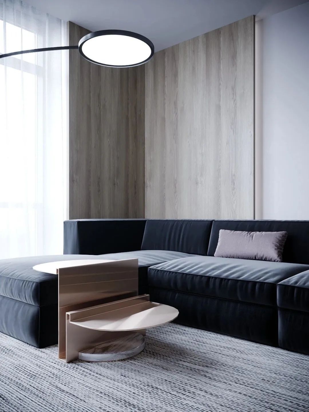 客厅中,设计师选用高级灰作为空间的主色调,再搭配金属与原木元素作为空间的点缀,打造简约轻奢的质感。造型简洁的落地灯,线条感十足,为客厅增添明亮的视觉感受。深灰色的沙发使得空间更加沉稳,金属的边桌提升了空间的质感。