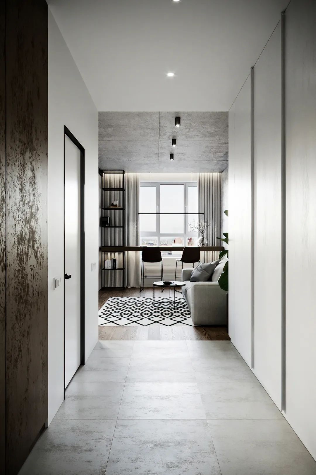 从入口的玄关处进来便可以将整个室内的摆设一览无遗,木色的地面明确地将玄关和客厅等位置划分开来,木质的餐桌与皮质餐椅形成一股洒脱感,原始的水泥天花板和墙面彰显出轻工业风格的特性。