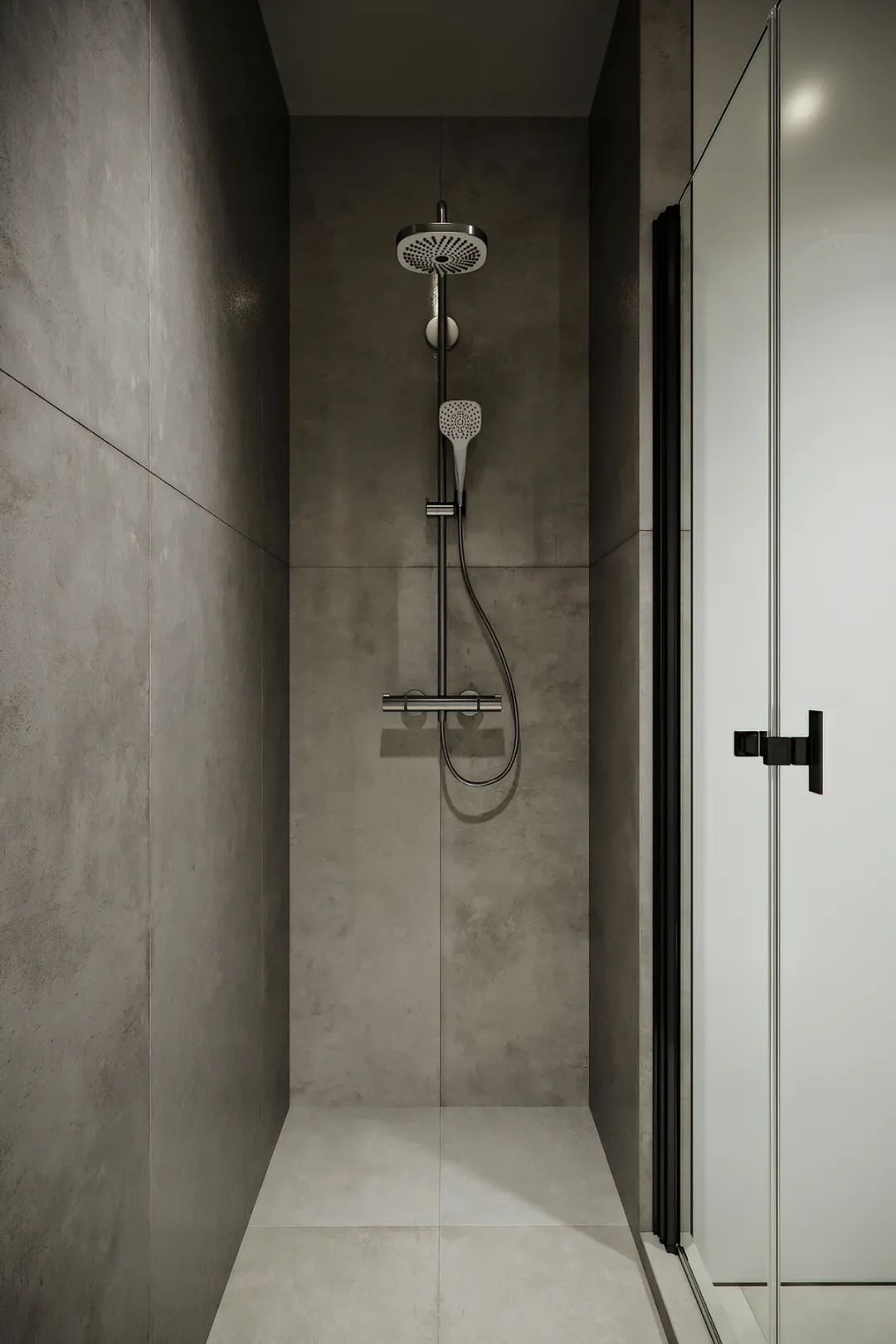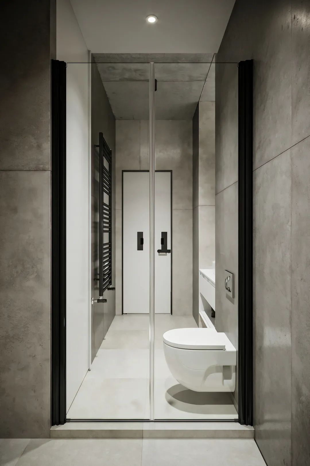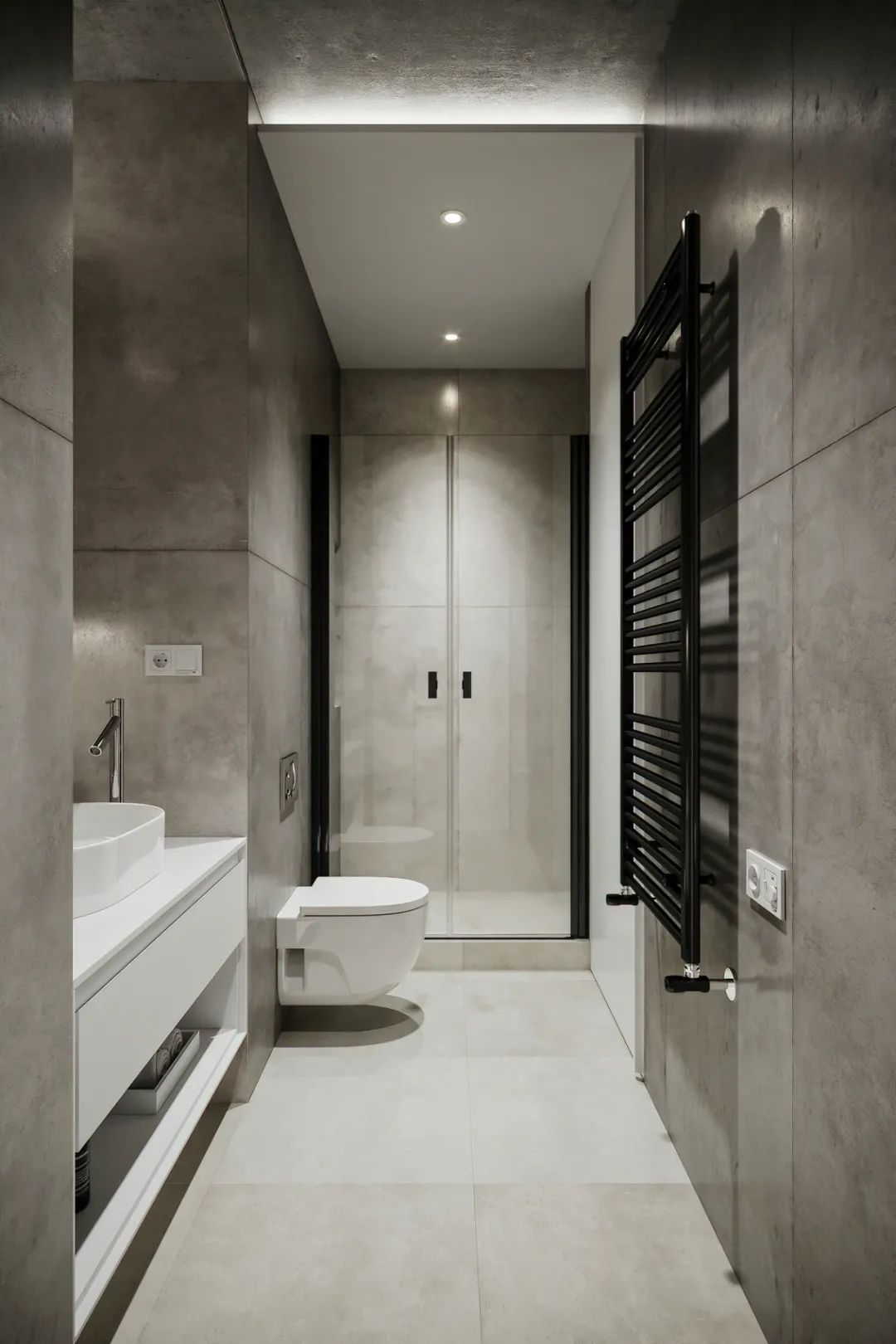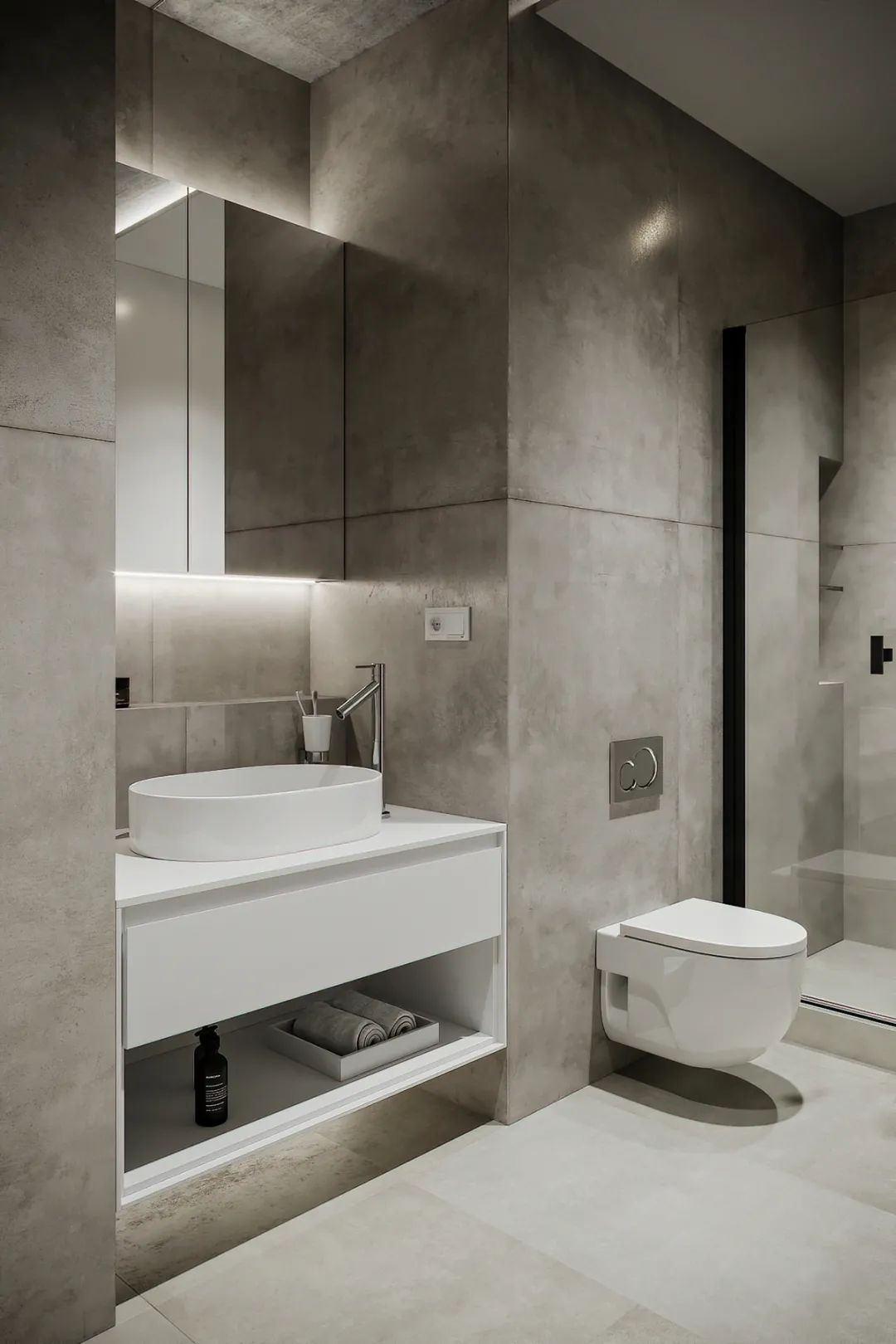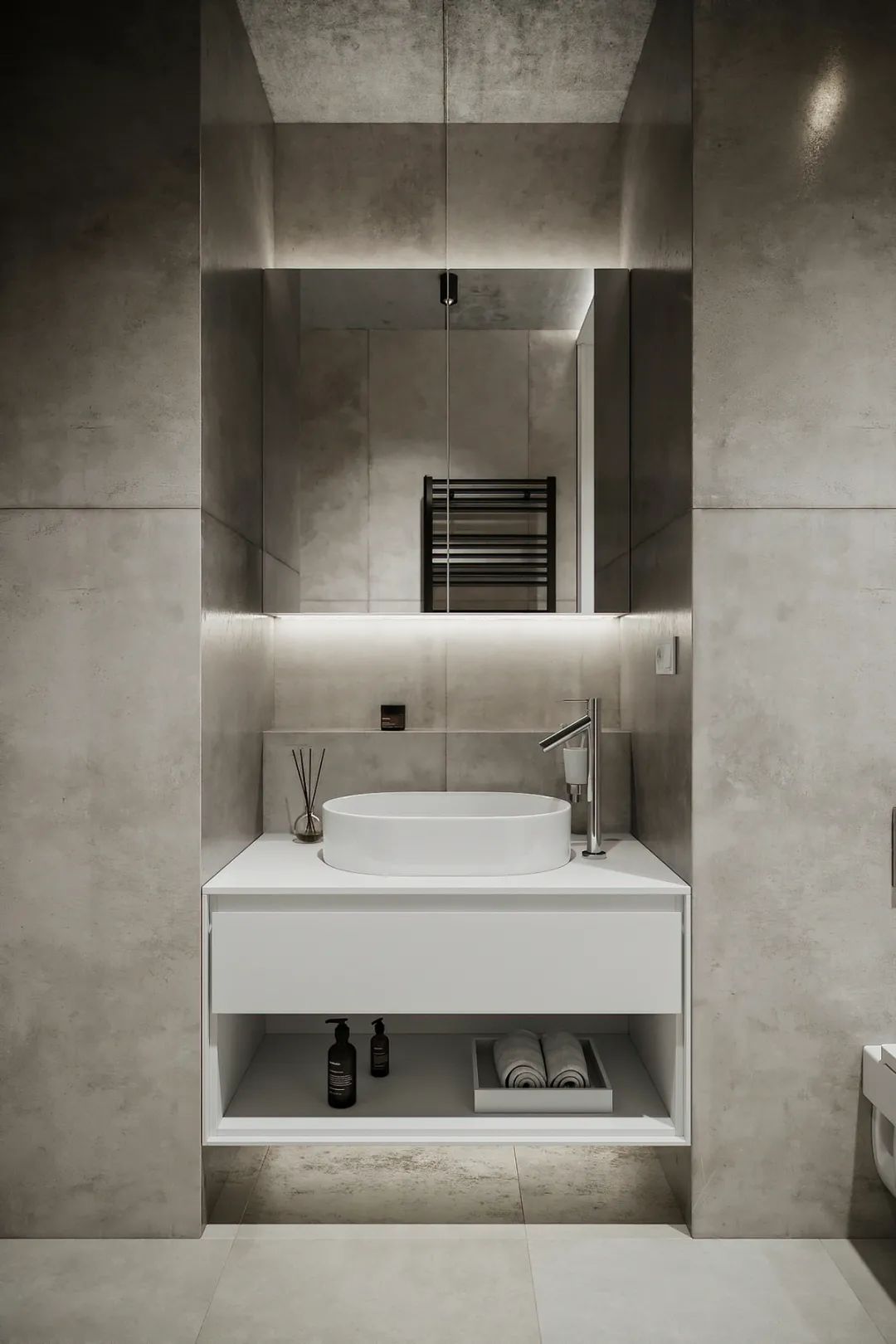 浴室以水泥墙面为基调,在有限的空间范围内也完成了干湿分离的布置。洁白的洗手槽使视觉空间看起来更大,同时也具备了时尚感。