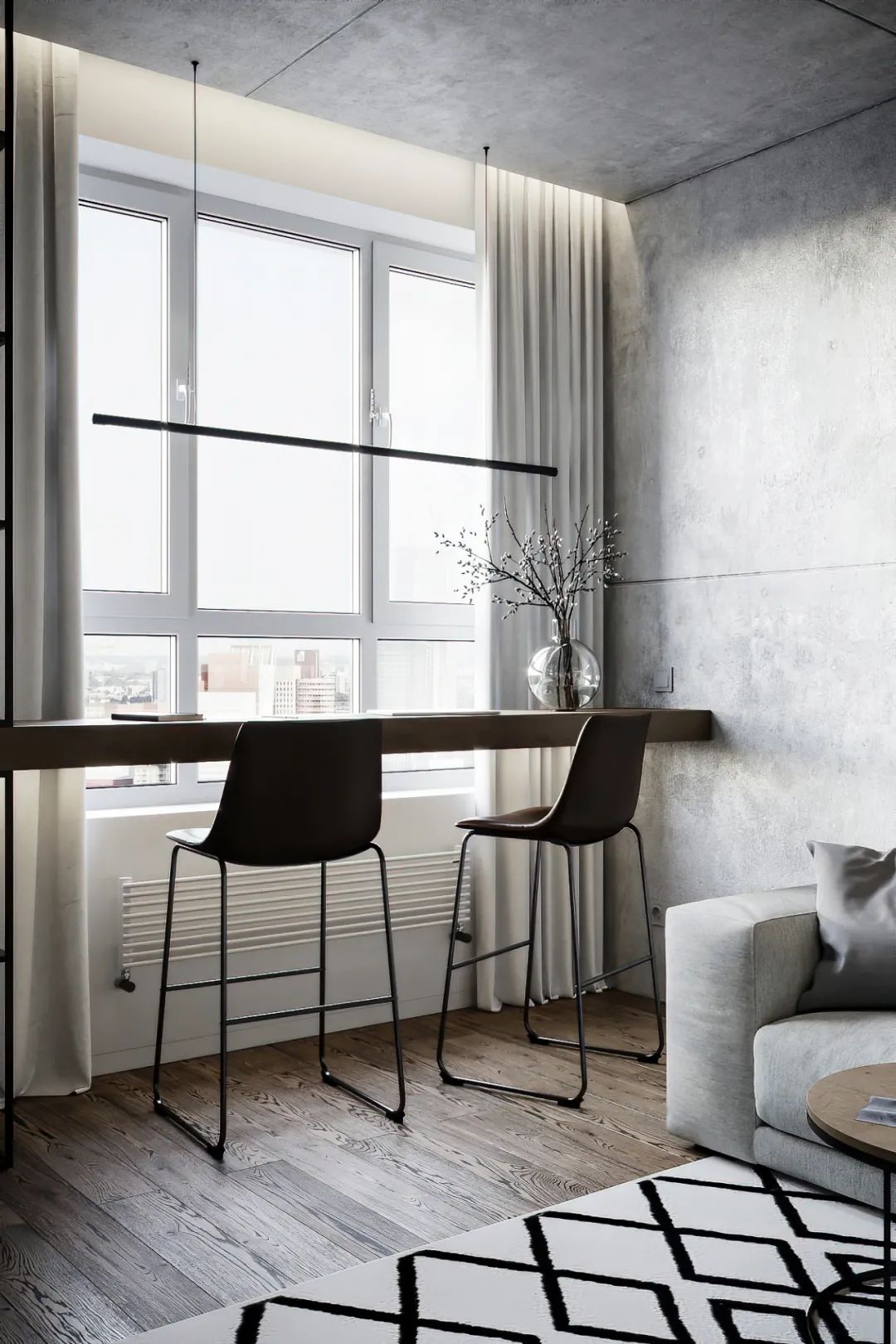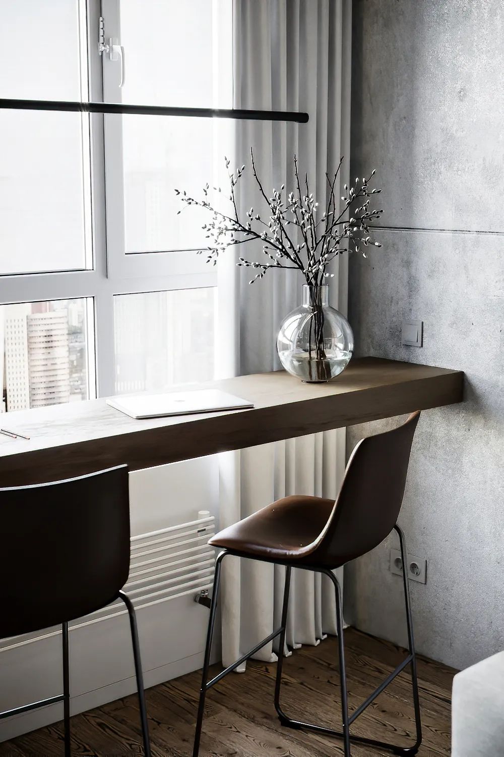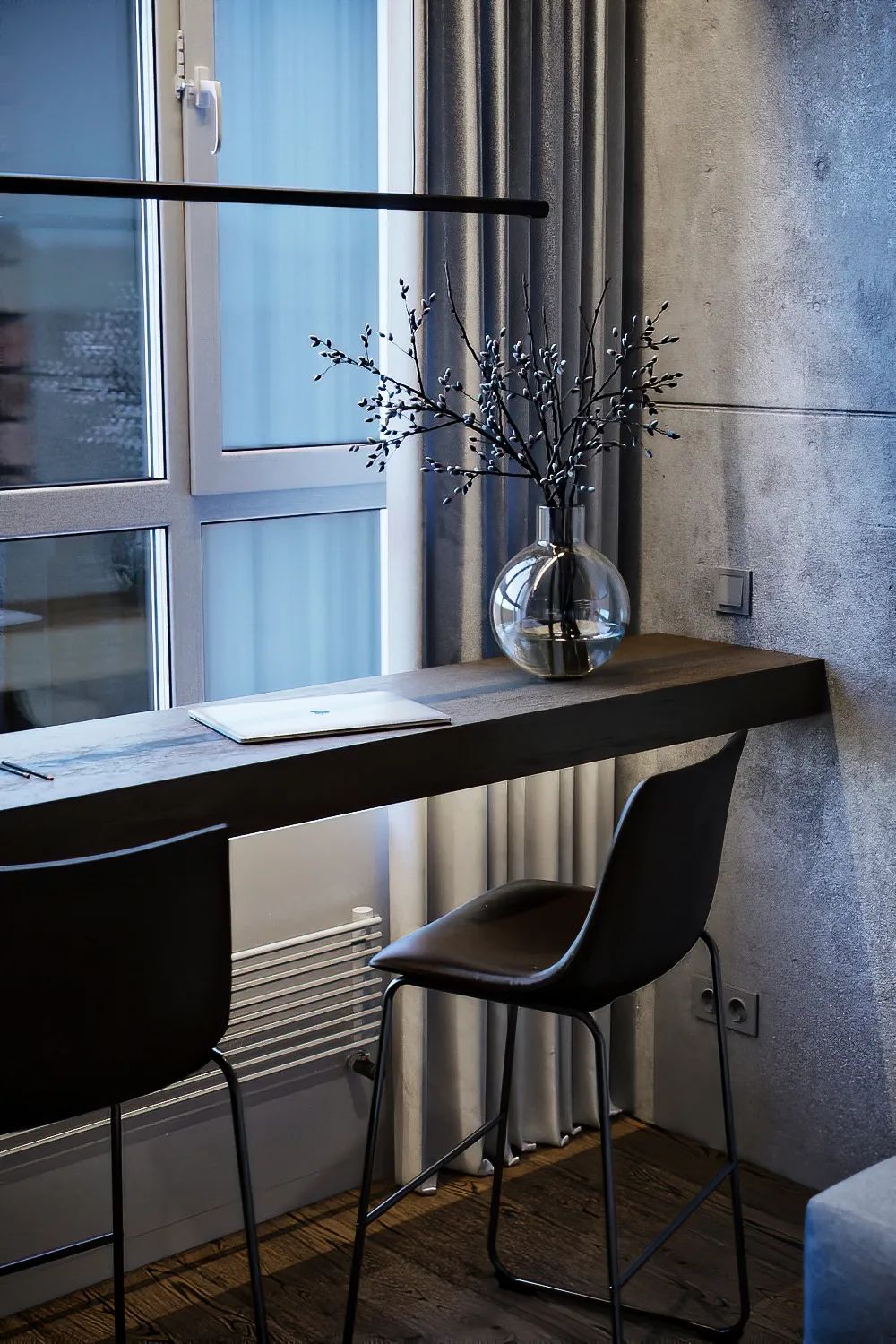 休闲区可充当办公区域使用,它位于整个家里光线最好的位置,并且坐拥着窗外一片美丽的景色,浅灰色的窗帘与墙壁的颜色相呼应,给人一种前卫的氛围。