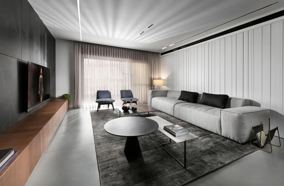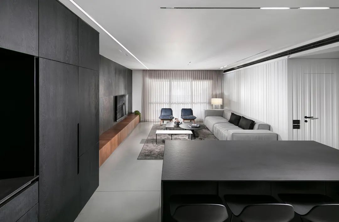 公寓的整体依旧是采用高级灰配色,低饱和度的色彩搭配营造了一种高压绚烂的空间气质,简单的配色贯穿于空间中,使得空间的整体性更强。