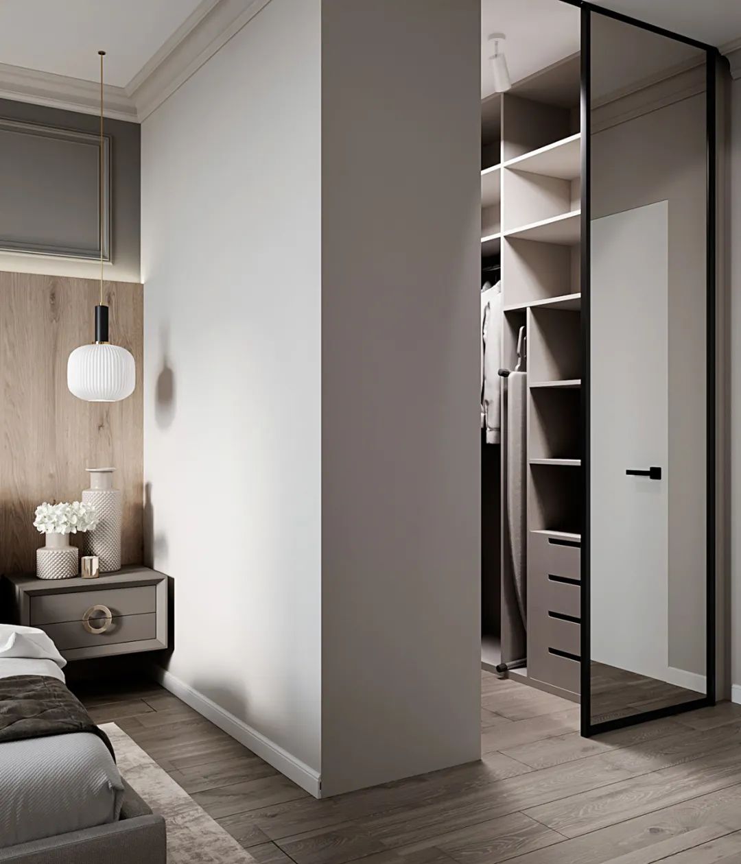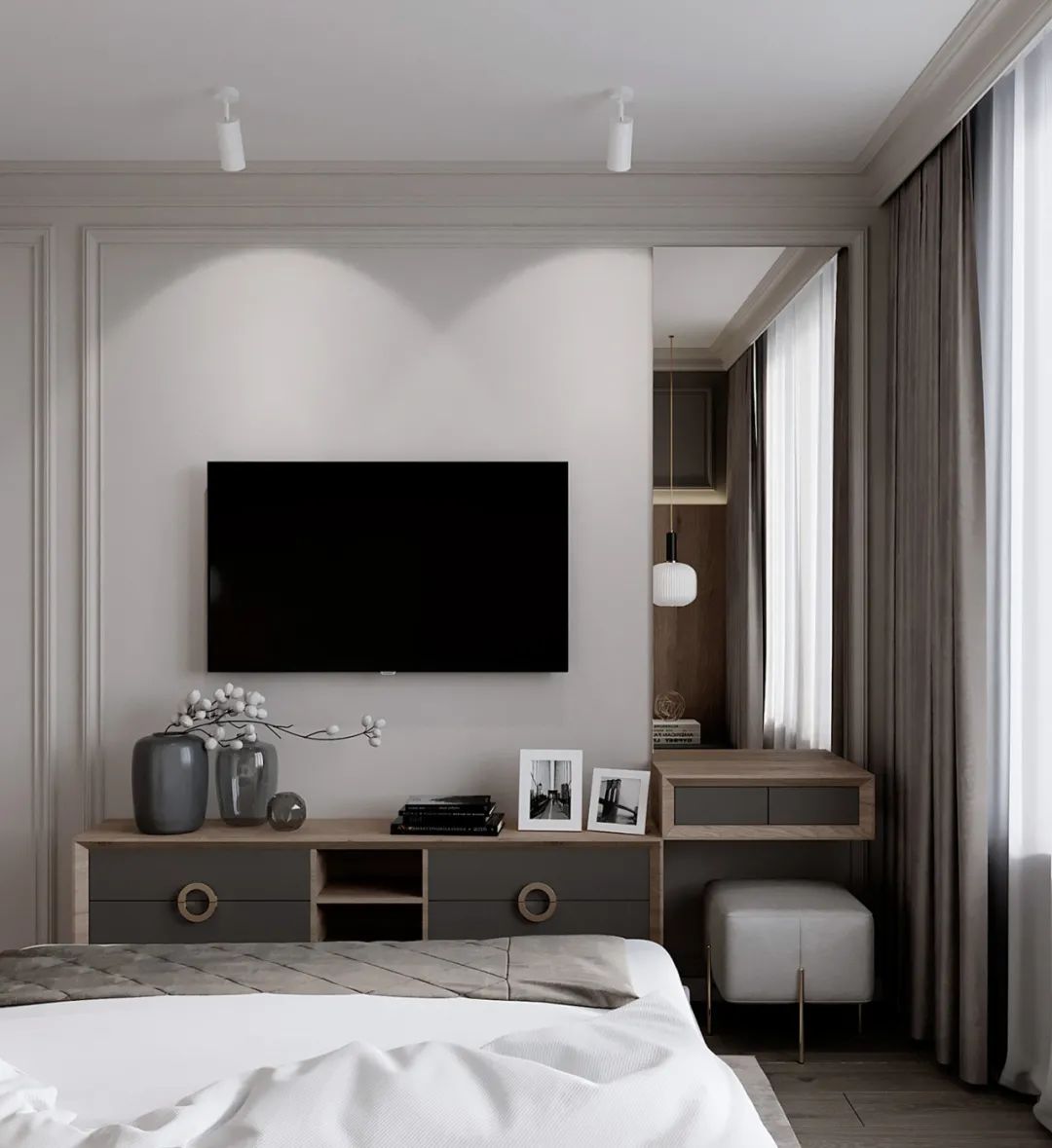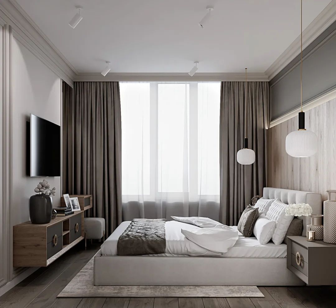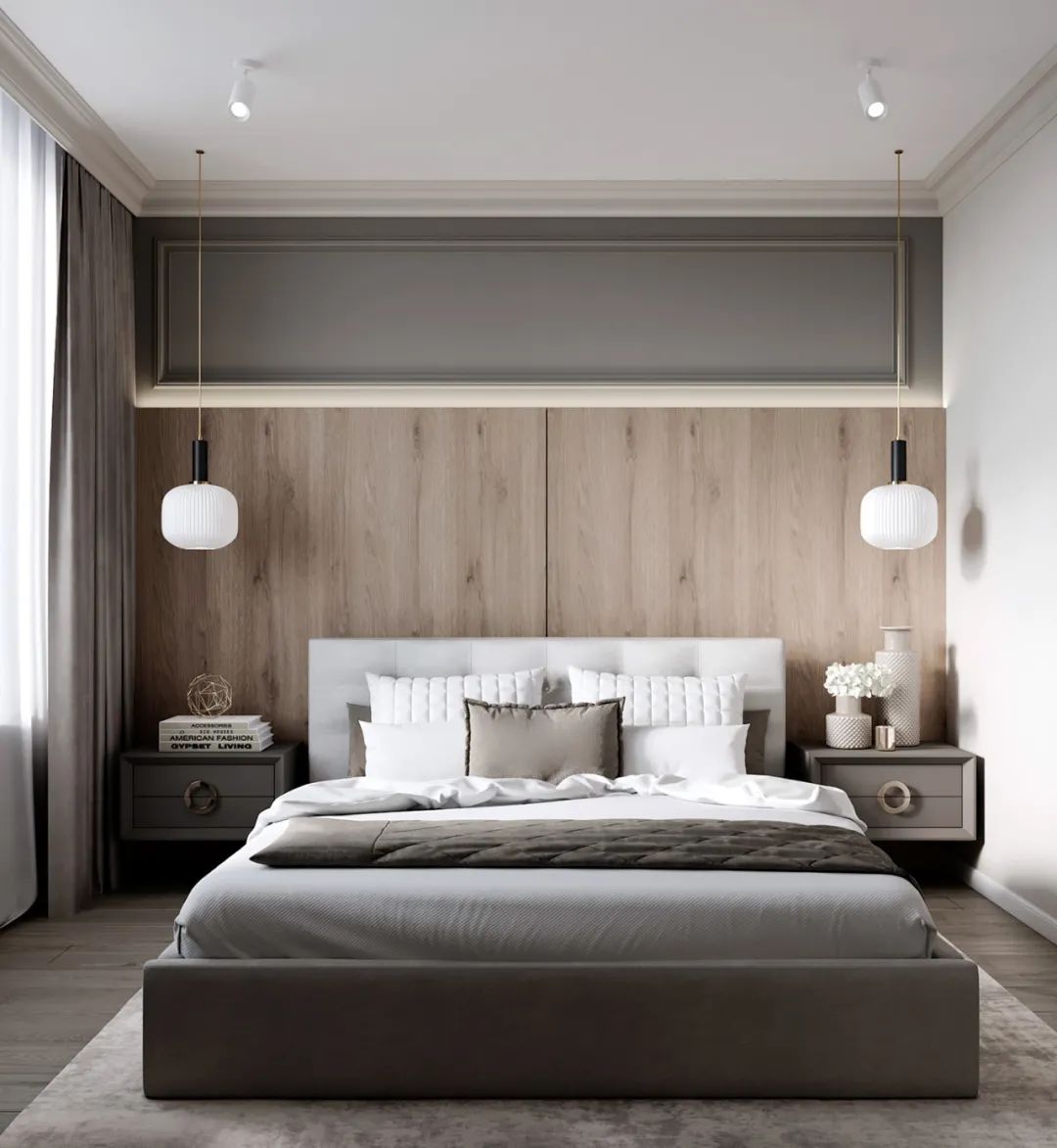 卧室内的软装则选用浅灰色和原木色系,自然光照射进来的同时,也让室内显得明亮惬意。