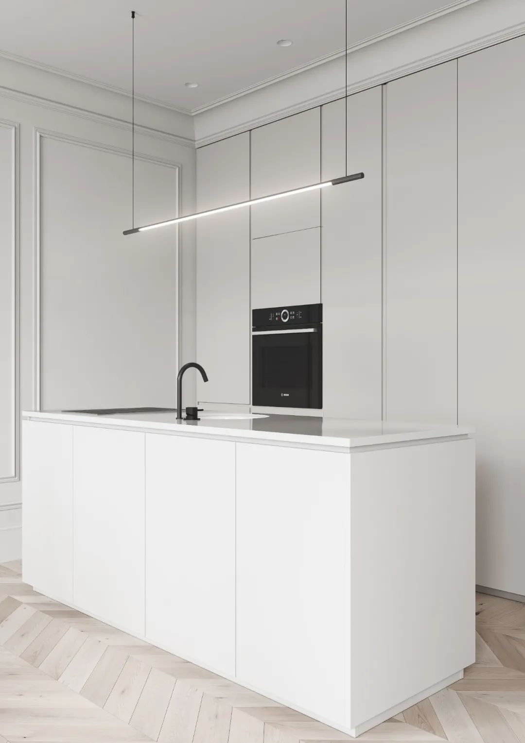 踏入客厅,极强的艺术氛围包裹了整个空间,精致的餐盘式吊灯,哑光的喷漆餐桌,极简的平面天花板,都强有力地烘托出用餐区域的美感和精致感。