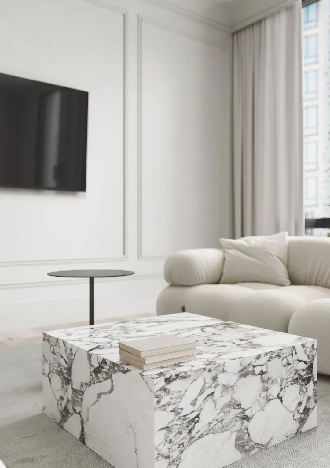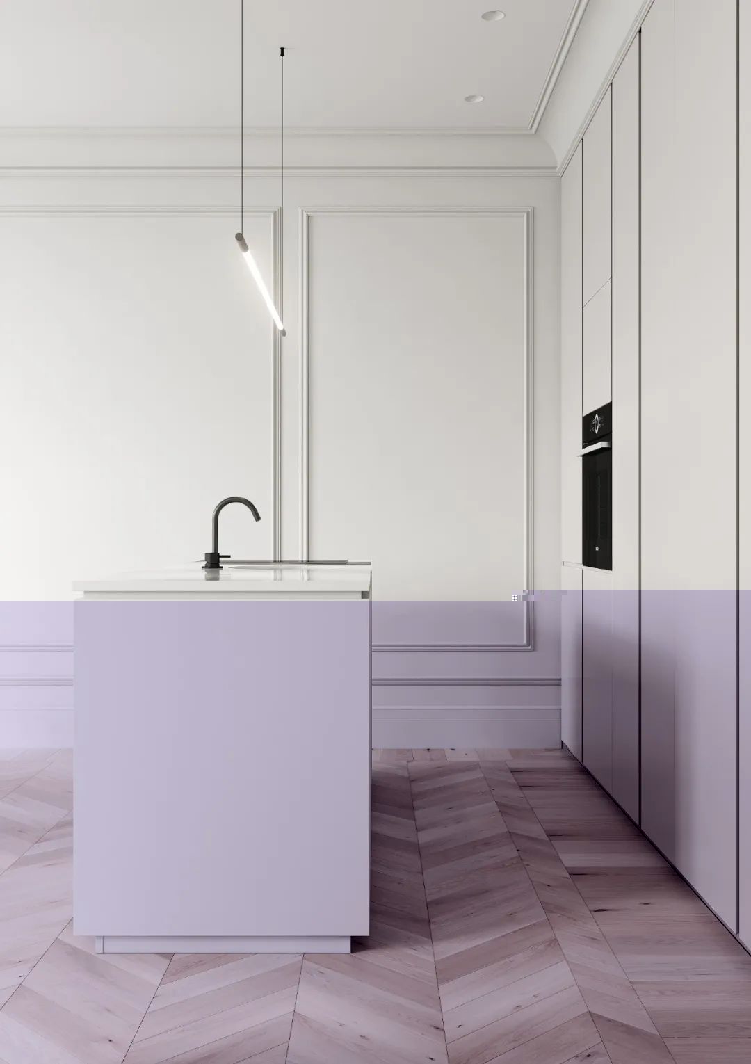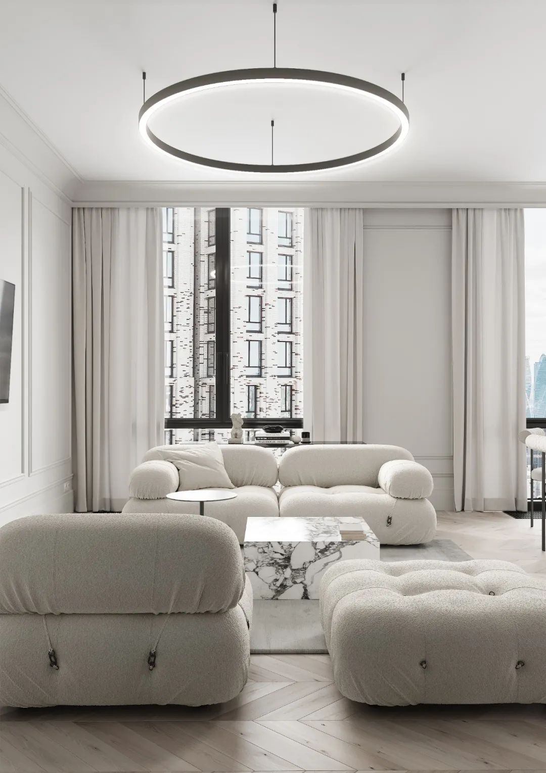 设计师在内部设计中采用了方形,同时采用了餐盘形状的吊灯,让整个客厅显得柔和简洁。客厅和用餐区以及厨房就证据了整个公寓的一半。